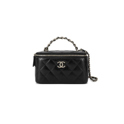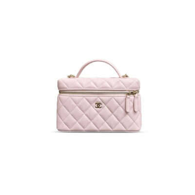 CH@NEL LAMBSKIN QUILTED MINI TOP HANDLE VANITY CASE WITH CHAIN LIGHT PINK 1334686 (10*9*7cm)
